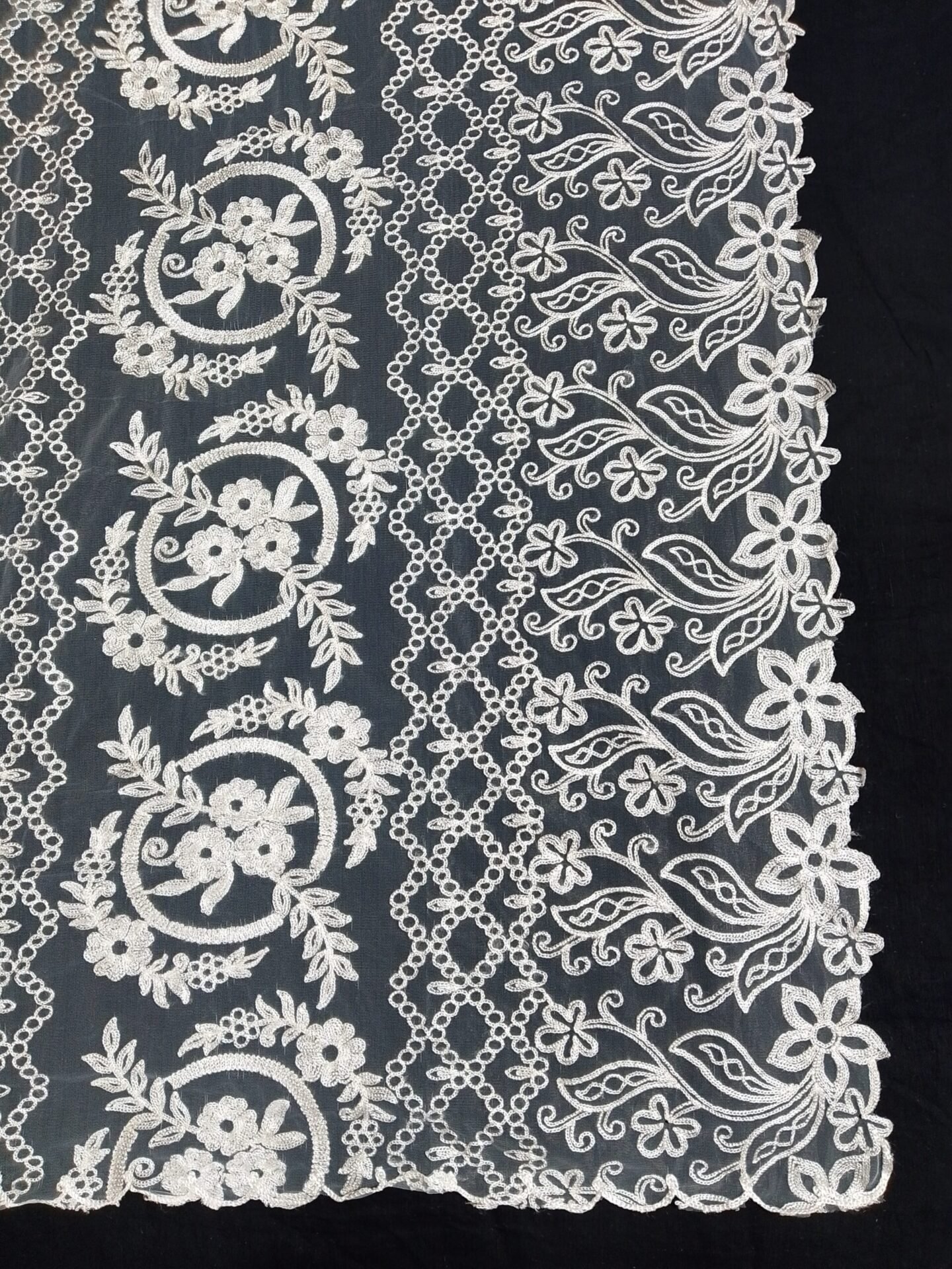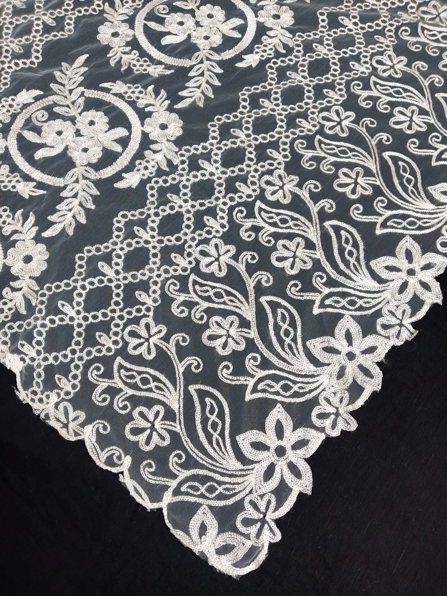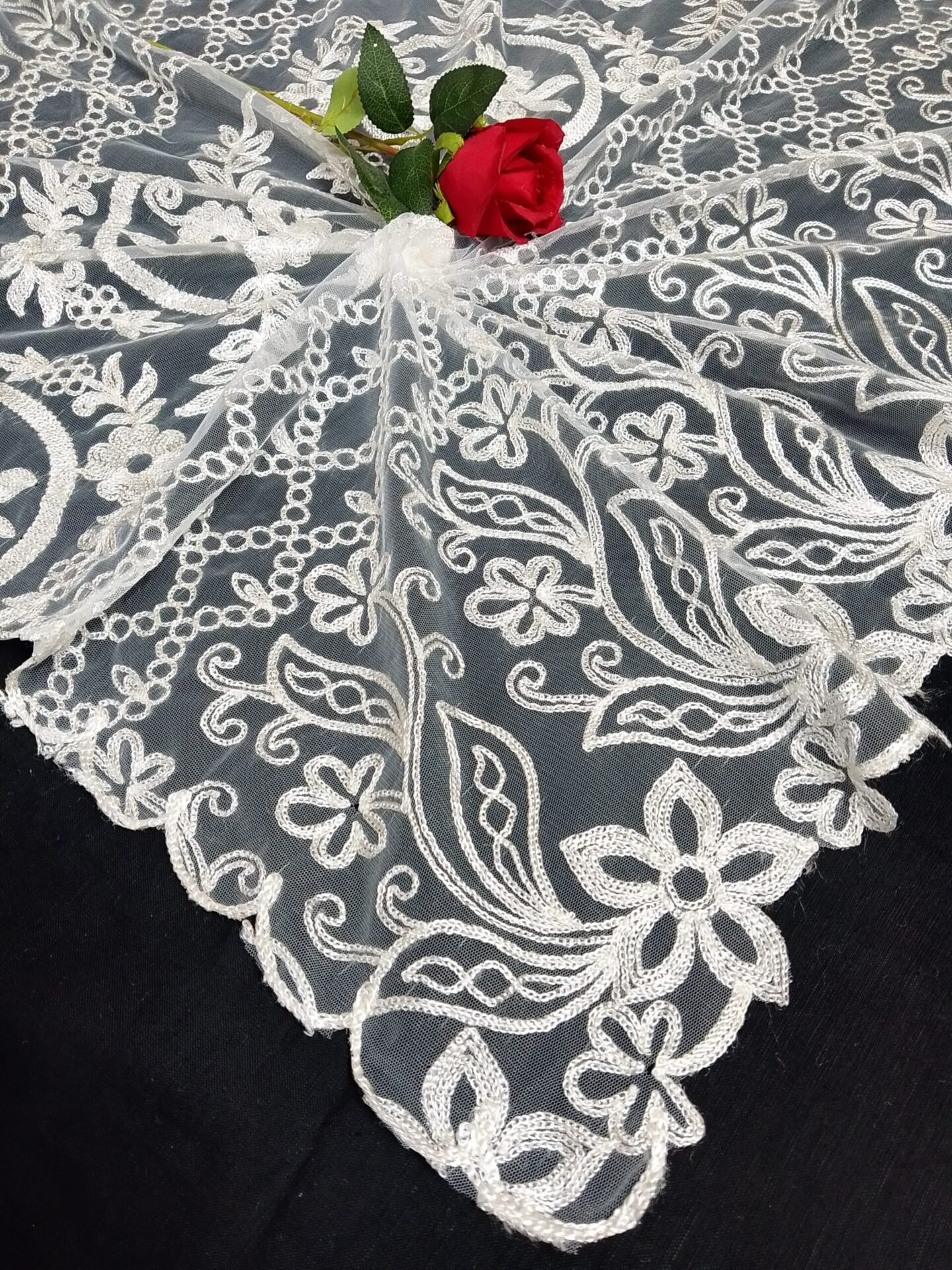 This artistic net dupatta is beautifully crafted with classic vine embroidery created using fine white thread embroidery on premium
