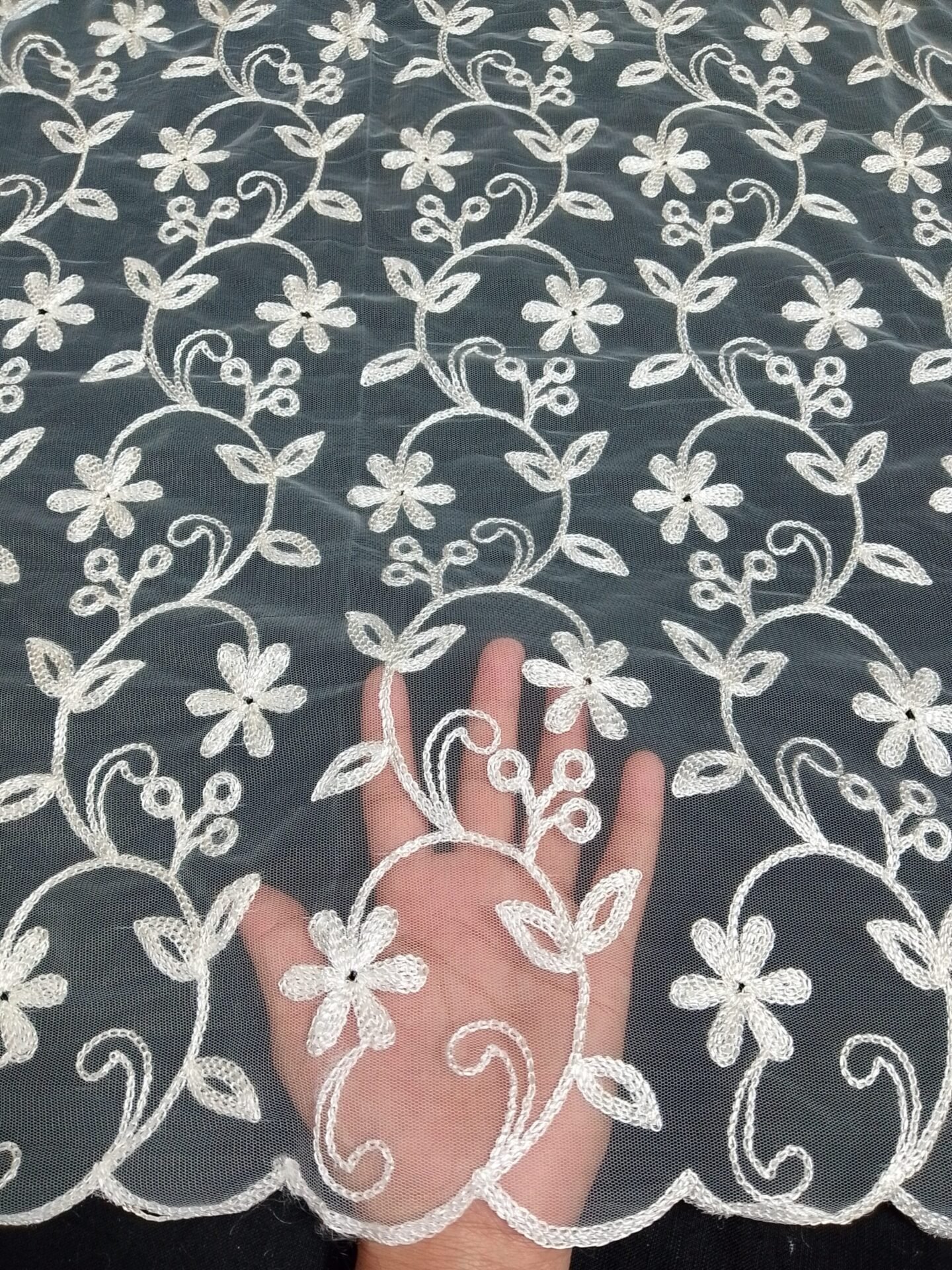 dresses. The transparent net base highlights the detailed thread work while maintaining a lightweight and